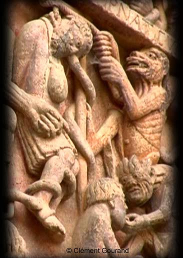 (3) Is it the usurer coveting the purse put in the cup or, as we read all too often, a "drunkard" who regurgitates his drinking? To avoid gross errors of interpretation, one must admit that the studied object being clearly the reflection of a Christian view, it is essential to return to the symbols a meaning that is consistent with this ideology and not with the more or less Folk projections induced by our contemporary, secular, and even anticlerical moral conceptions. In this case, usury, widely denounced as immoral in the Bible is again condemned by the Second Lateran Council in 1139. The loan sharks were the first, says Jacques Le Goff, to benefit from the Purgatory in the thirteenth century. (See La Naissance du Purgatoire, folio histoire p. 54). But who does it bother among our contemporaries to see the banker, the speculator or the stockbroker, thrown into Tartarus by the monks of the Romanesque civilization? (Back to text)