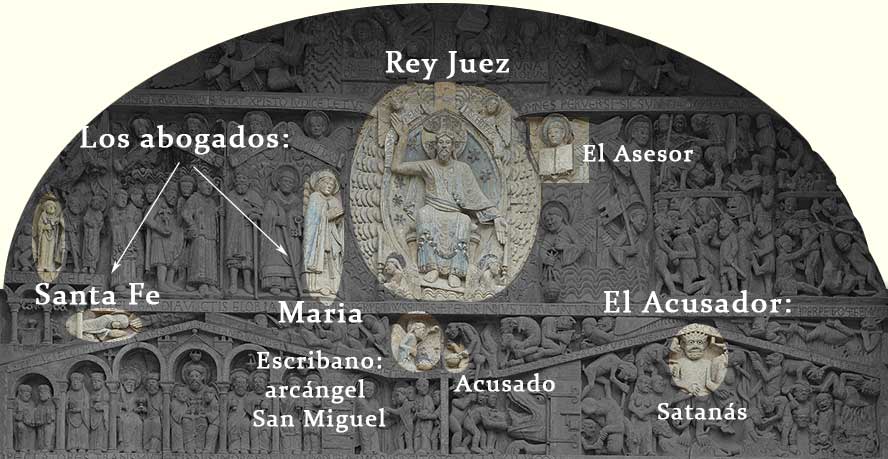 Literalmente, el tímpano escenifica un drama escatológico, el de un juicio con acusación y defensa. Cada actor del tribunal está en su lugar: |