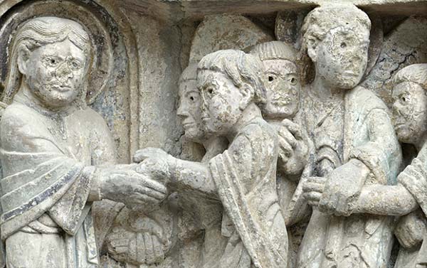 (1) Ce geste est très répandu dans l'iconographie médiévale. Par exemple, sur le tympan roman de la porte Miègeville, de la basilique Saint-Sernin à Toulouse, chacun des douze apôtres répète ce geste alors qu'ils assistent à l'Ascension du Christ. (voir une illustration) (remonter)